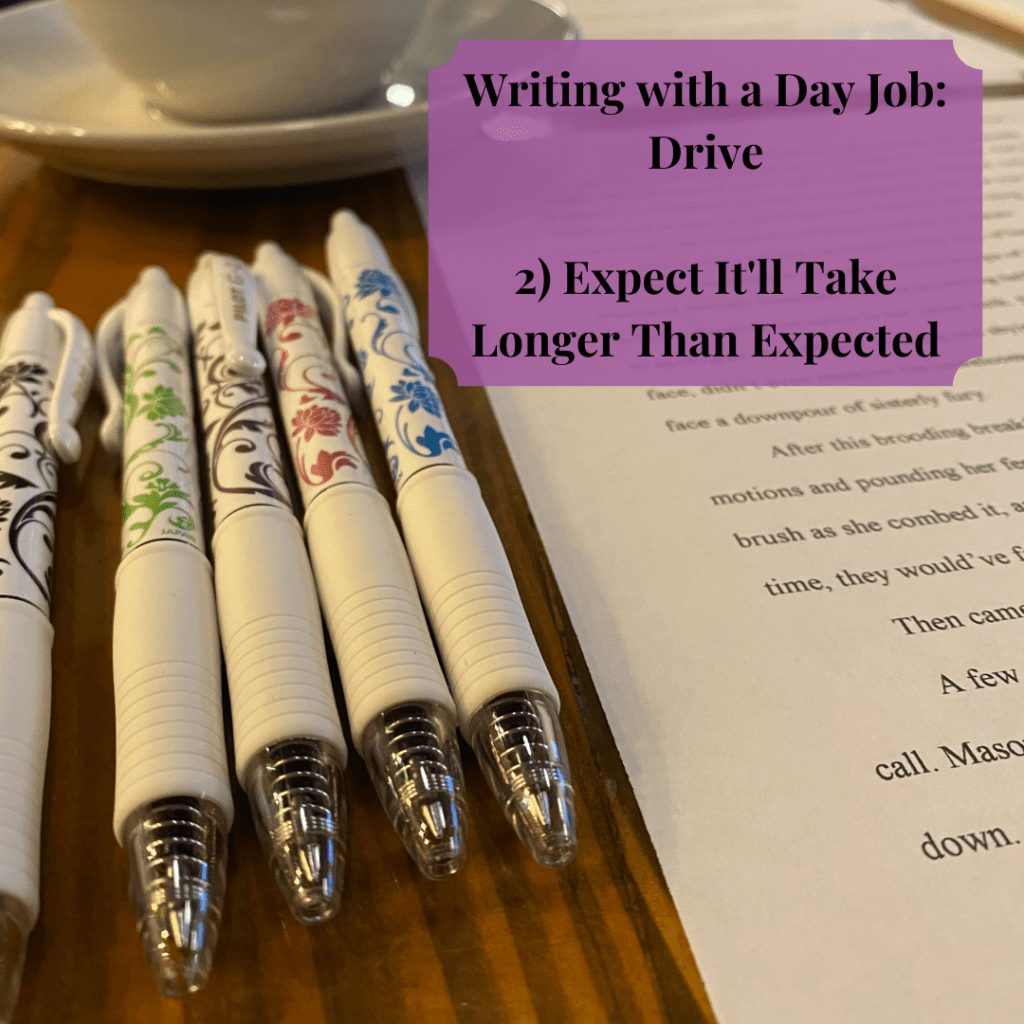 2) Expect it’ll take longer than expected: We also need to be realistic with ourselves and our writing. We cannot possibly control everything in our lives. We can’t anticipate setbacks with our work, needing to take more time with a draft or character arc, etc. Life, too, is full of the unexpected. If you have kids, there’s always unexpected moments (good and bad) to respond to. We don’t plan on bad days at work that leave us too drained to muster up the energy. Vacations or holidays can take us out of our normal rhythm and make it hard to reenter normal life. Give yourself grace with your writing and keep in mind that your timeline probably won’t progress as quickly as you’d like. Be patient, and let the finish line ahead continue to drive you forward rather than discourage you to give up partway through.