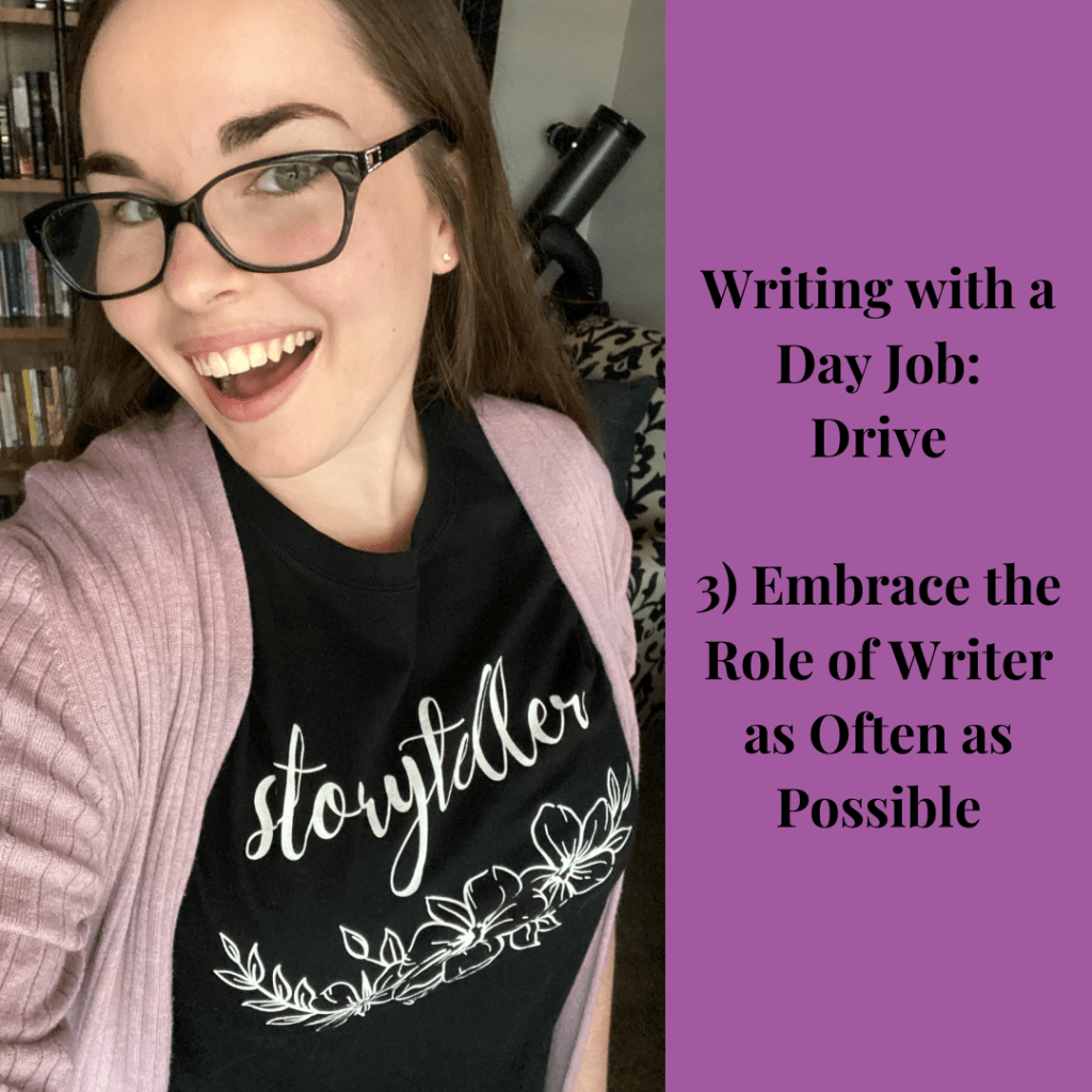 3) Embrace the role of writer as often as possible: Finally, taking yourself seriously as a writer is a huge part of maintaining drive. Get in the headspace of an author. Carry a notebook with you. Dream about plots and characters and worlds when you’re out on a walk or making dinner. Listen to podcasts on writing. Talk to other writers about their work and share about yours. Think through how you would describe the sunrises you see on your drive to work. Study your favorite books to see how they pull off their themes so effectively. Do the things and think the things that make you feel like a writer. When you embrace your role as a writer, it’s easier to keep your momentum, even in the stifling moments. Don’t be shy about calling yourself a writer either. Reject those lies I mentioned earlier and keep leaning into this aspect of your identity.